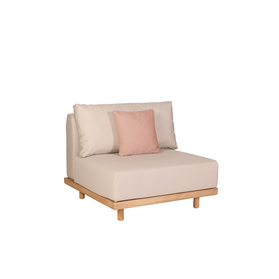 A generous modular deep seating collection that combines teak frame accents, Sunbrella RainĀ® fabric and deep cushion upholstery. Complemented by a bridging table topped with Italian ceramic. The modular system is versatile and will allow you to configure your choice.
