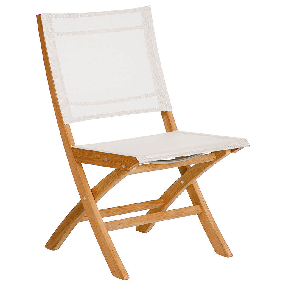 This is one of our very popular folding chairs with flush stainless steel fittings and Textilene® slings. There is a mechanism to lock the chair in the open position and the chair folds by lifting the seat.