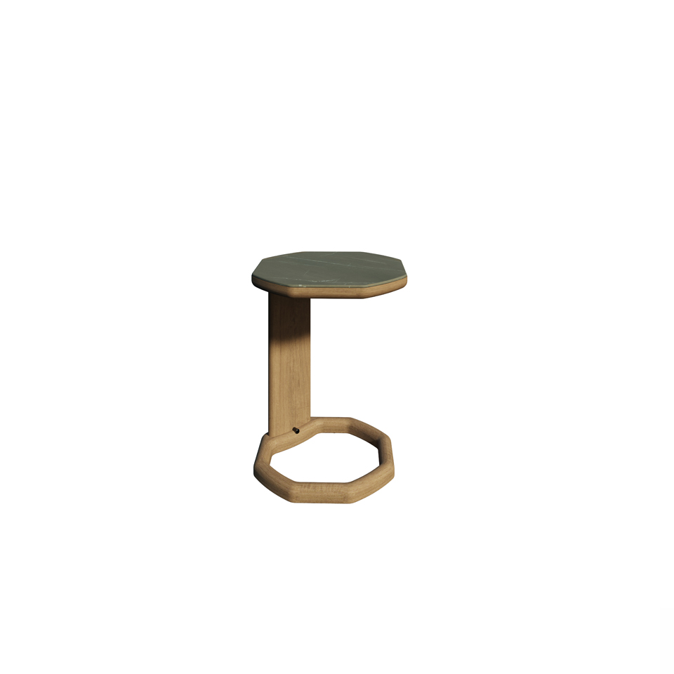 An octagonal cantilever side table with gentle angles. Premium teak frame and Italian ceramic top.